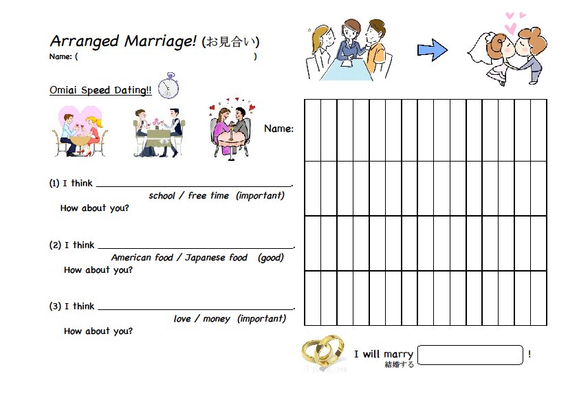 Then I explain to them what “speed-dating†is. Some students have probably heard of Omiai (Japanese arranged marriages), but few have probably heard of speed-dating. Once I explain that, I tell them we’re going to have a speed dating party in class today! (cue round one of squealing).