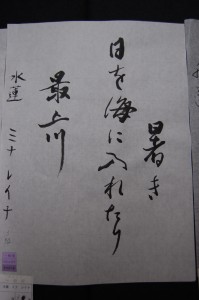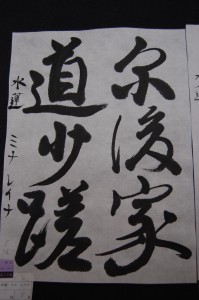 Darker and using less ink, almost dry sumi (India ink) is more beautiful. A popular subject matter of shinwayo is haiku which has both soft fluid kana paired with oddly shaped, simplified kanji. Larger and less symmetrical, shinwayo style looks best with dark ink as well as “kasure” style, having the line fade as the ink runs out. Kanji is always dark and clean. Too much water in the sumi means splotches and the paper absorbs too much, bleeding out the lines you’ve made. The most difficult point for all three is the balance.