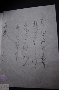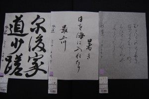 Subject matter also differs: kanji, as it originated from China, uses mostly older Chinese characters which Japan does not use. At the basic level, it is 4 kanji characters written from top to bottom, right to left. As difficulty increases, so does the number of kanji, and balance becomes more difficult to control. Kana subject matter is most famously known to be hand-written letters, but can also include poetry like waka and haiku. What is most difficult about kana is that the characters are almost a continuous, fluid line, each letter continuing into the next character and following the flow of stroke order. This means that you hardly lift your brush off the paper, from the first letter at the beginning of the line of the waka or haiku, to the bottom of the page, which makes brush pressure and flow more challenging to control.