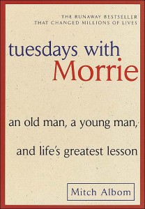 I don’t know what took me so long to read Tuesdays with Morrie.  It’s famous and recommended constantly, but I somehow let it go by the wayside for years. Finally, I got my hands on a copy, and it was horse-blinders until I was finished with it. I read the whole book in a day: I started it after the morning meeting – I read it between classes – and then I sped home so I could finish it in my apartment. It took hold of me, as it seems to have done with the other 11-million-plus people who have bought it.   I wondered, what could all of us millions of readers find in this little book that is so compelling? I found the answers in both the ying and the yang – we find life in the face of death.