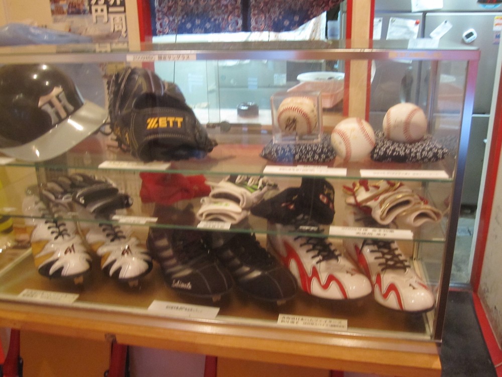 Located within the shadows of the overpass that seems to graze the side of the stadium itself, Koshien Ramen is a mere hop and step from the gates of the hallowed Tigers playground. The rain which had caused the game to be cancelled also ensured that customers weren’t flooding into this place. Dressed in our Tigers best, and looking a bit worse for wet wear, we were looked upon sympathetically by the Hanshin-themed restaurant’s owners. A round of beers and each face looked a bit brighter. Orders of gyoza and ramen were placed and spirits were lifted. The owner took the time to show us signed memorabilia he’d collected from over the years, even letting yours truly take a couple of (very careful) hacks in the restaurant.