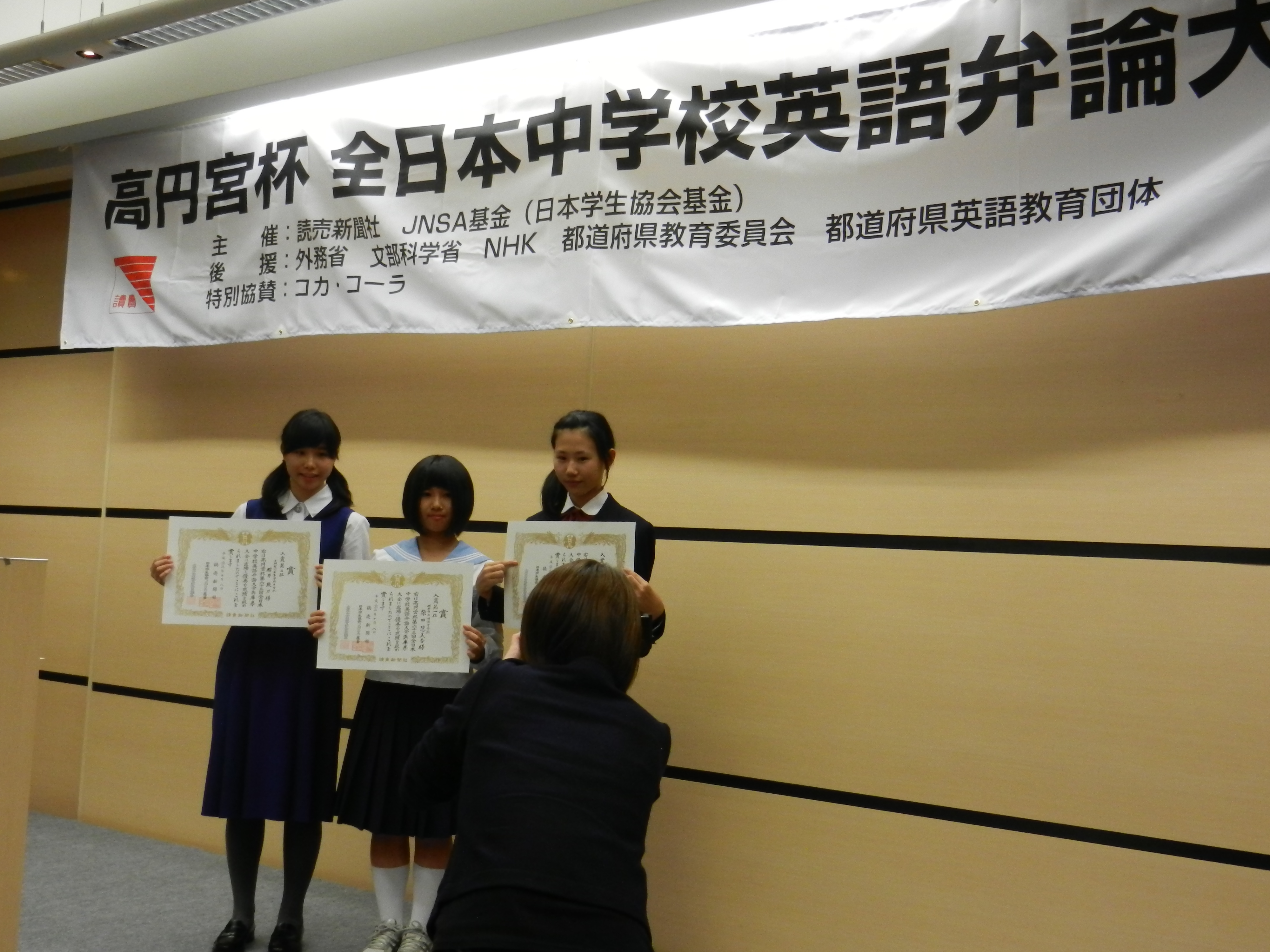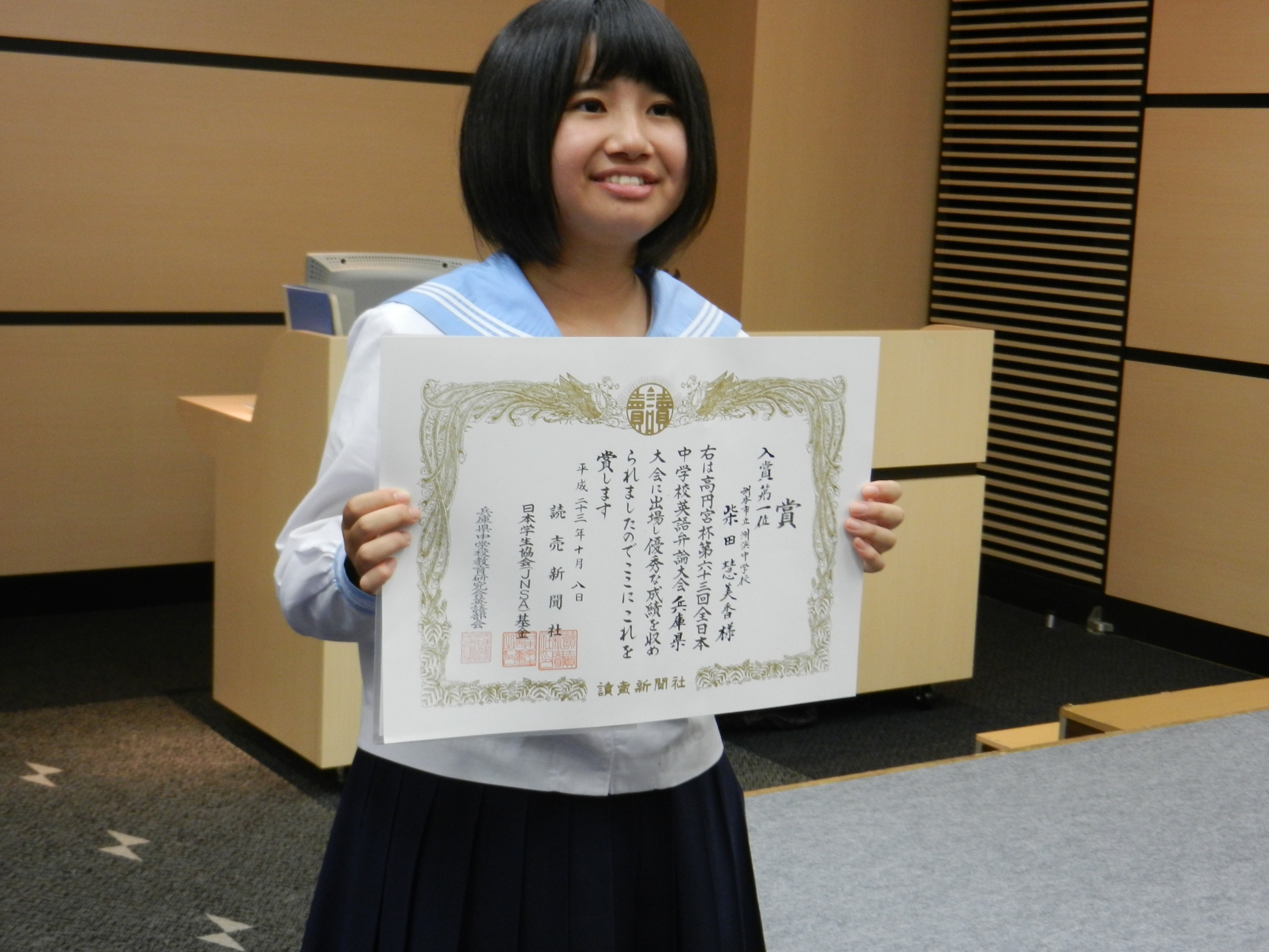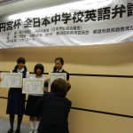 On October 8th, we headed to Kobe for the Hyogo Prefectural Preliminaries for the 63rd Prince Takamado All Japan Inter-Middle School English Oratorical Contest. Emika preformed 14th out of the 30 applicants, and it was flawless! She even had the judges laughing. As we waited for the results, other ALT’s and students came to talk to Emika and me. They were shocked that it was my first year, her first contest, and that we lived on Awaji Island. Many had been attending for years and students had been competing since they were first years. Finally the results were announced, Emika Shibata won 1st place and scored close to perfect! Her mother sobbed hysterically with joy, others looked shocked, and we just beamed. Tokyo here we come!