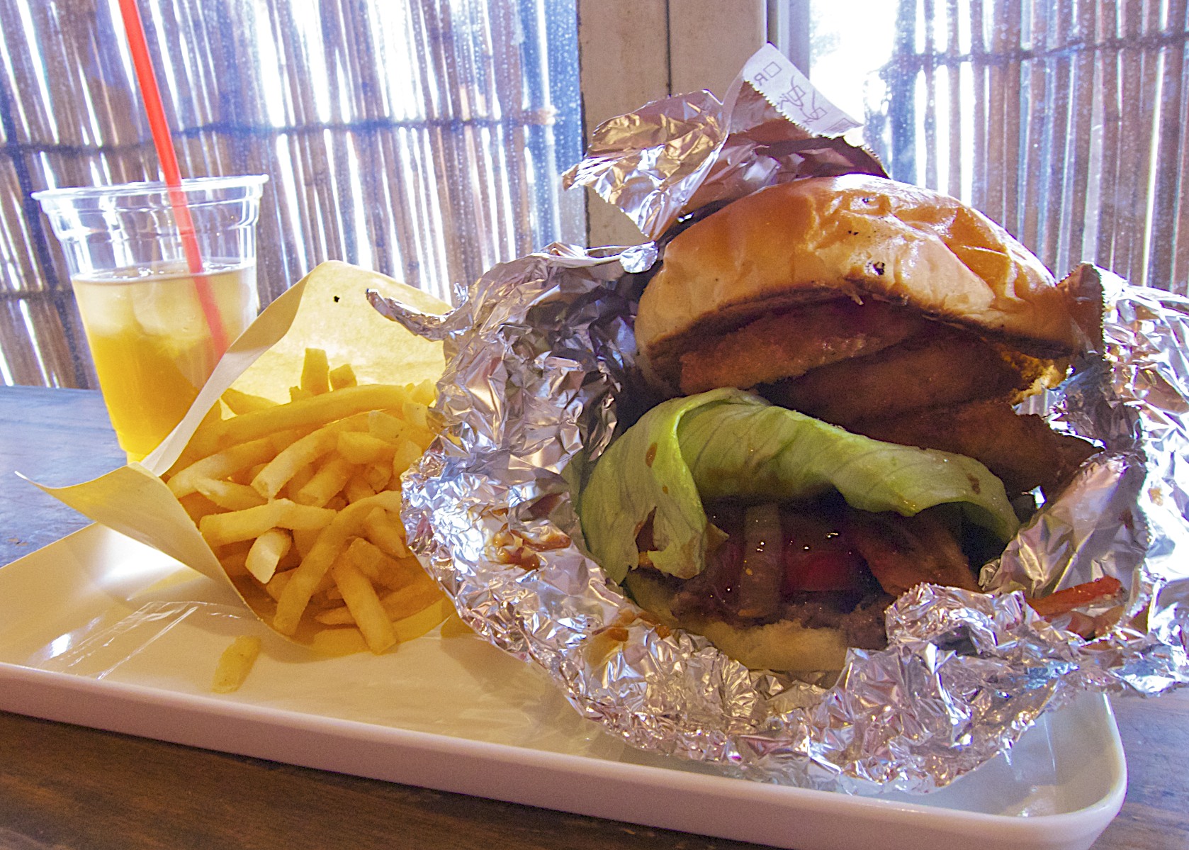 The choices are simple. You can have a large burger (650 yen) or a small burger (500 yen.) It comes with lettuce, tomato, sautéed Awaji onions, mayo and secret sauce, which tasted like a sweet and tangy bbq sauce. It really is a good sauce and brought the whole burger together quite nicely. For an extra 100 yen each, you can add onion rings (which are famous and rightfully so,) bacon, a fried egg, or cheese. The freshly made onion rings are hot and crispy and alone are worth making the trip for. Any vegetarians who won‘t be partaking of the burger itself need not fear disappointment. They also offer Kona Beer from Hawaii, which is a nice treat for those who want something different to the sometimes insipid beers of Japan. I made the mistake of ordering a side of fries with my burger. Unlike the rest of the offerings, the fries were not good at all – cold, a bit soggy, and boring.