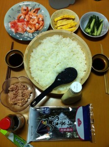 Put toppings, rice and seaweed sheets on the table with soy sauce and mayonnaise and everyone can make their sushi rolls as they like them