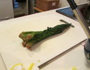 7. Cut the spinach into 1 inch blocks and place into the dashi mix.