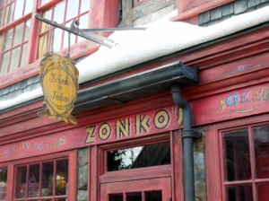 Next door to Honeydukes is Zonko’s Joke Shop. You’ll enter via the front entrance of Honeydukes. Zonko’s is a treat to wander through; Fred and George would approve of the décor. The product line is limited to Fanged Frisbees, Sneakoscopes, Pygmie Puffs (the stuffed version), and Extendable Ears.