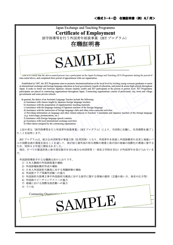 Another document that you might need to get is a Certificate of Participation. Essentially, this is a bilingual document that certifies that you worked for your contracting organization on the JET Programme for your contract period. If you need one, contact your Contracting Organization and ask them for a Zaishoku Shoumeisho (在職証明書)