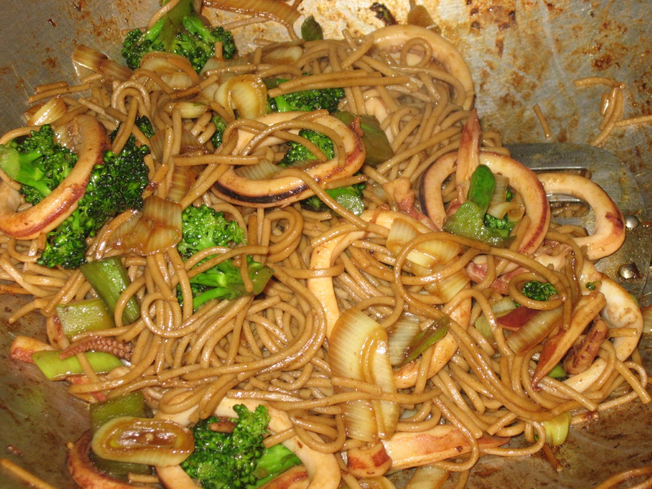 - Once the broccoli has started to soften, but is still green and slightly crunchy, add the squid back in, and add the soba. Stir-fry everything for a minute or so, until things get nice and warm. Taste the sauce for salt / sugar, tweaking as desired. Then remove from heat, plate and serve.