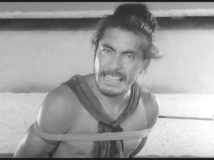 You would think, perhaps, that a film this ridiculous would at least have some over-the-top violence. In the seventies, films such as Lady Snowblood pioneered the blood shower; the idea that getting sliced with a sword or, if you were unlucky, having an entire limb cut off would result in an instantaneous monsoon of blood. Typically, this would drench the attacker a la Kill Bill (which is actually based on Lady Snowblood). Remember, though, that Jet is merely rock, not heavy metal, and blood is unbecoming on very fashionable bandits. Thus, the number of times Tajomaru shows blood on a human being that has been cut down, as opposed to merely on the blade that did the cutting, is once, and that character had to show his blood by default; he was wearing his kimono open in order to display his shaved chest.