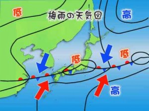 Japan’s rainy season, 梅雨 (tsuyu, or plum rains, because now it’s ume season, y’all) is caused by the meeting of two huge air masses: the moist air over the Pacific comes up against the cooler continental air mass, and parks right over east Asia for about two months, providing Japan, Taiwan, Korea, and east China with plentiful precipitation. The season ends when the warm air mass associated with the subtropical ridge pushes this stationary front north, giving us pure, unadulterated summer swelter.