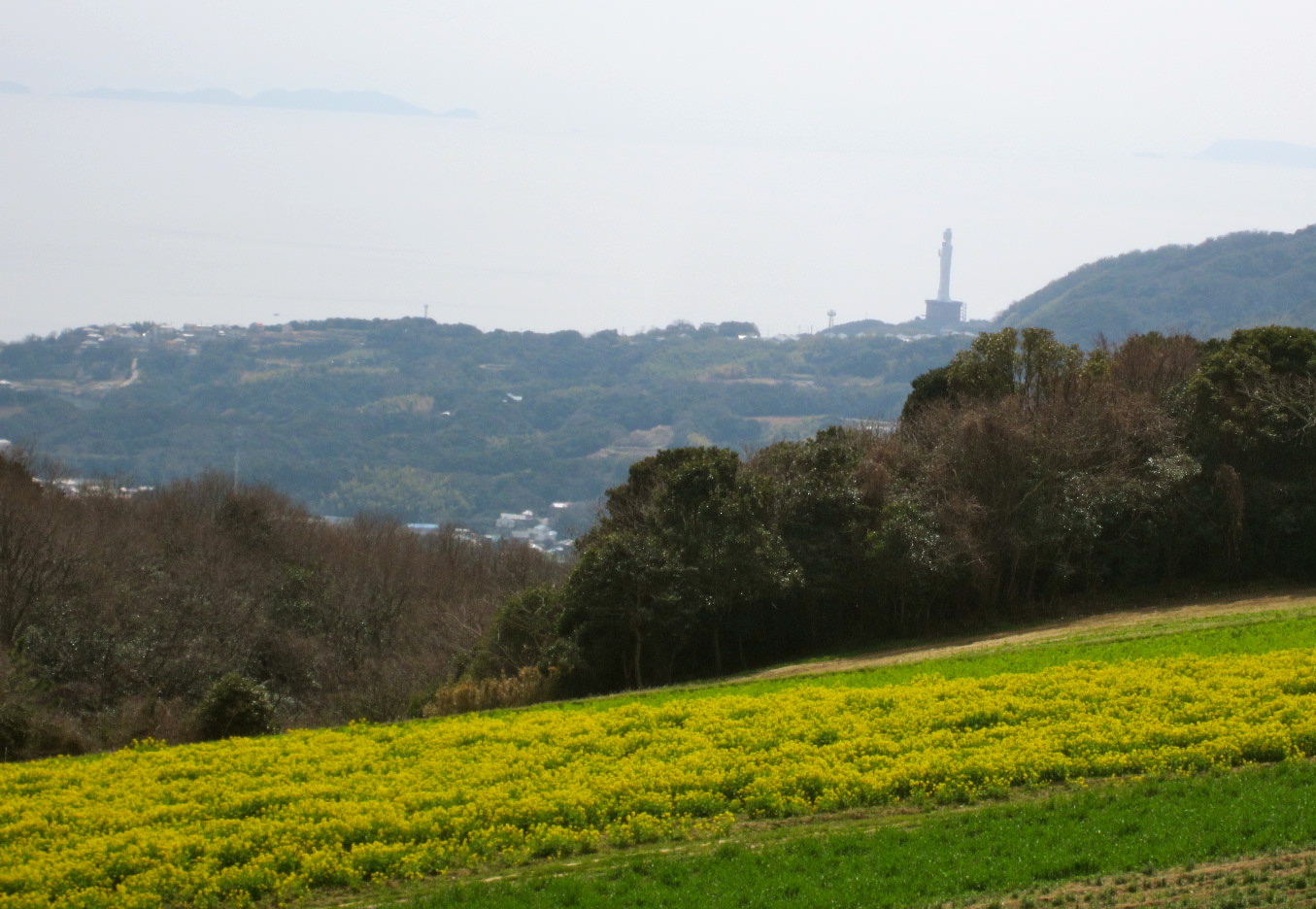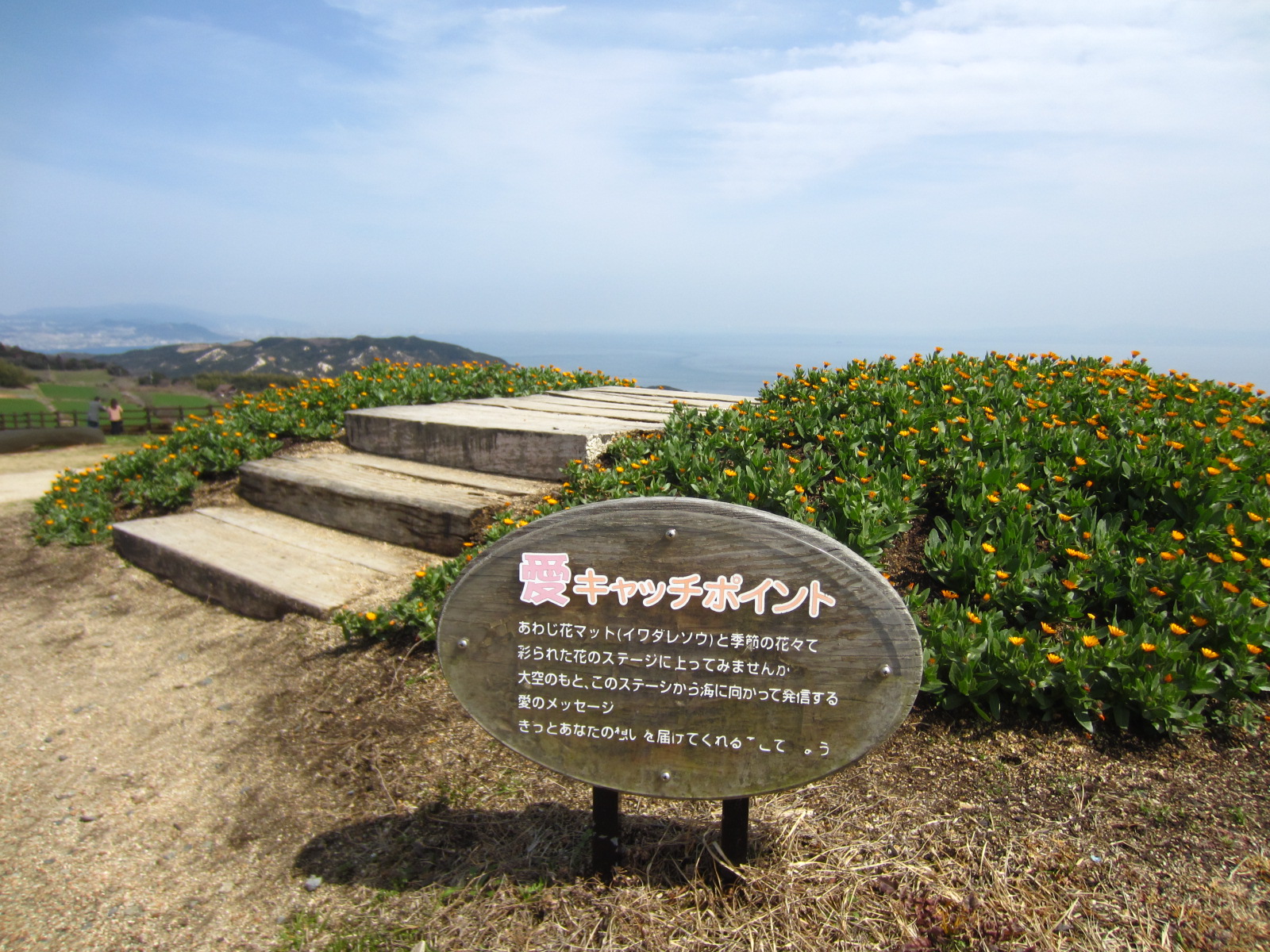 This scenic park is called, “Awaji Hanasajiki.†(ã‚ã‚ã˜èбã•ã˜ã)Right now the park is sprinkled with yellow rapeseed (èœ) and murasakihanana (ムラサã‚ãƒãƒŠãƒŠ) flowers. The hillside will soon be covered with a cascade of colorful Rinaria flowers through early May, and about mid-April you’ll be able to smile at the sunny plethora of poppies. The park is pretty big and you could spend all day there admiring the amazing view of Osaka, Kobe, and the Akashi Kaikyo Bridge. I would suggest bringing your painting supplies, a good book, a camera, and allergy medicine if you’re allergic to flowers. Being a hopeless romantic, my favorite part of the park was this small platform called, “Love Catch Point.†With the help of my friends, we attempted translating the instructions for you. We think it says something like, “Stand on top of the flower platform. Face toward the sea under the blue sky and say your message of love.†The bottom has broken off letters but we guessed it says something like “and it will be heard and come true.â€