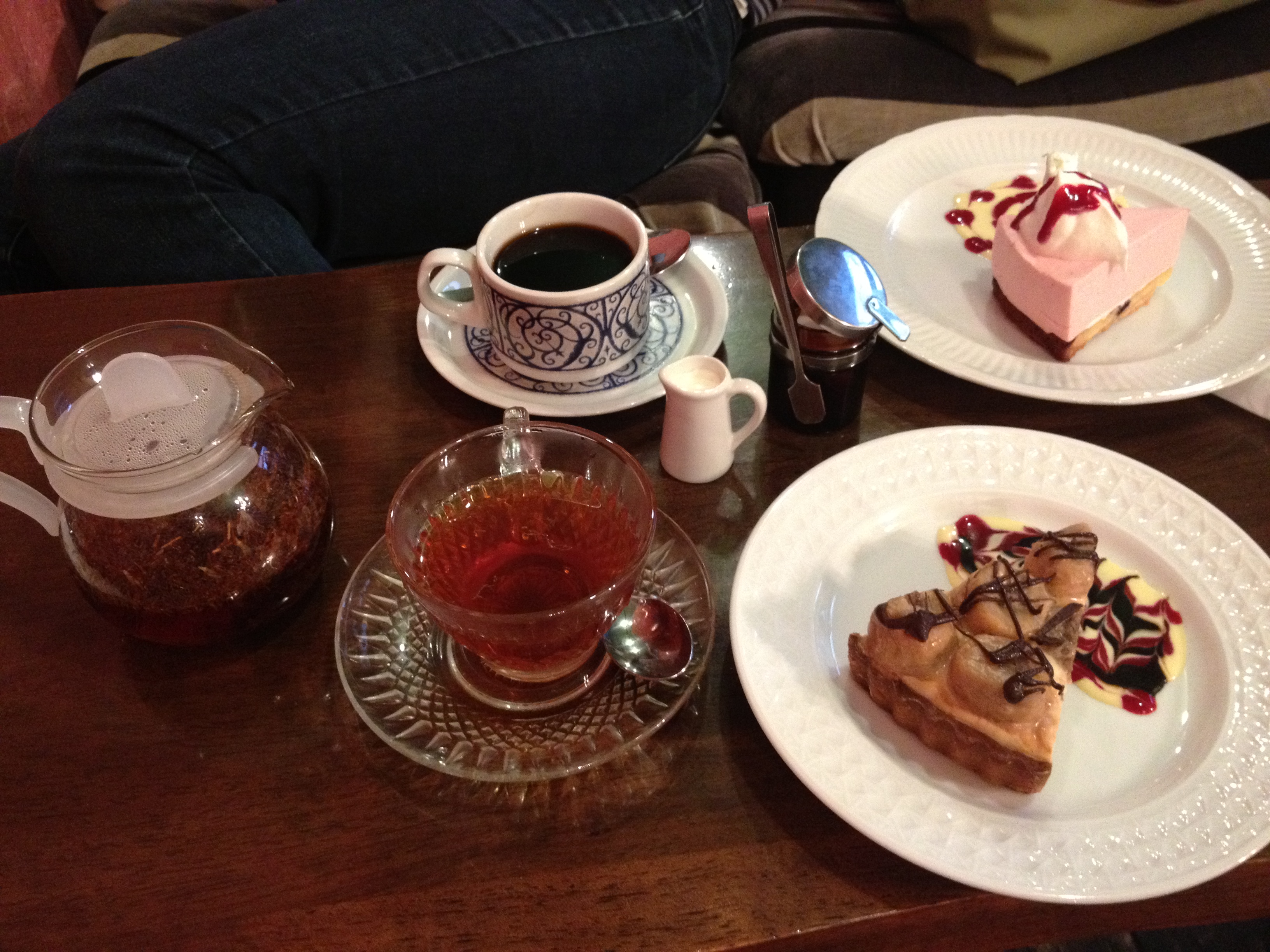 For the after party it was only right to order cake. One caramel, banana, chocolate cake with a clear pot of rooibos for me (~900円) and the strawberry cheesecake with a side of coffee for my friend please! Even though I was fully saturated from the taco-less taco I did not regret the sweet order. It was delish, and delicately complimented by the loose leaf tea.