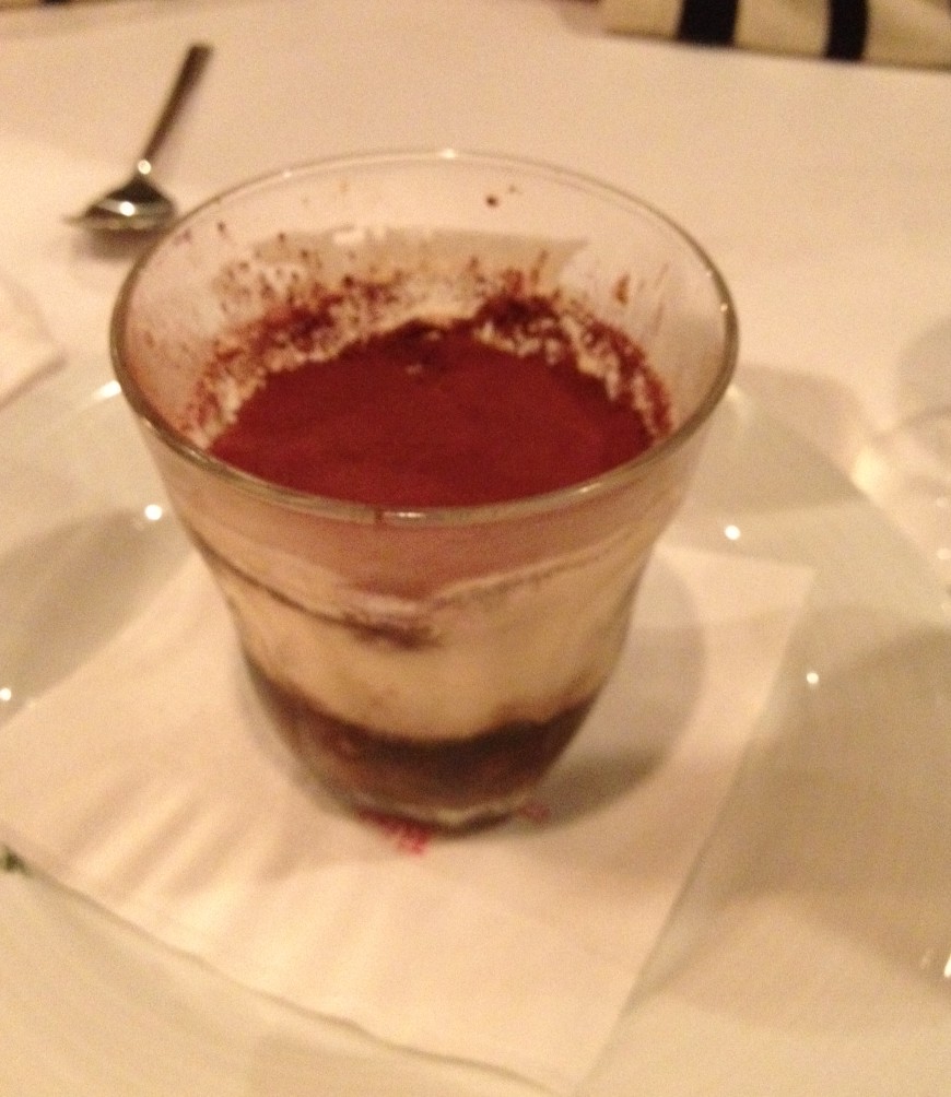 The meal was made perfect accompanied by a pleasant and perfectly chilled bottle of Gavi and followed by a tiramisu (rumoured to originate from brothels where it was served to fortify clients) which was made with very good, if slightly too much, coffee.