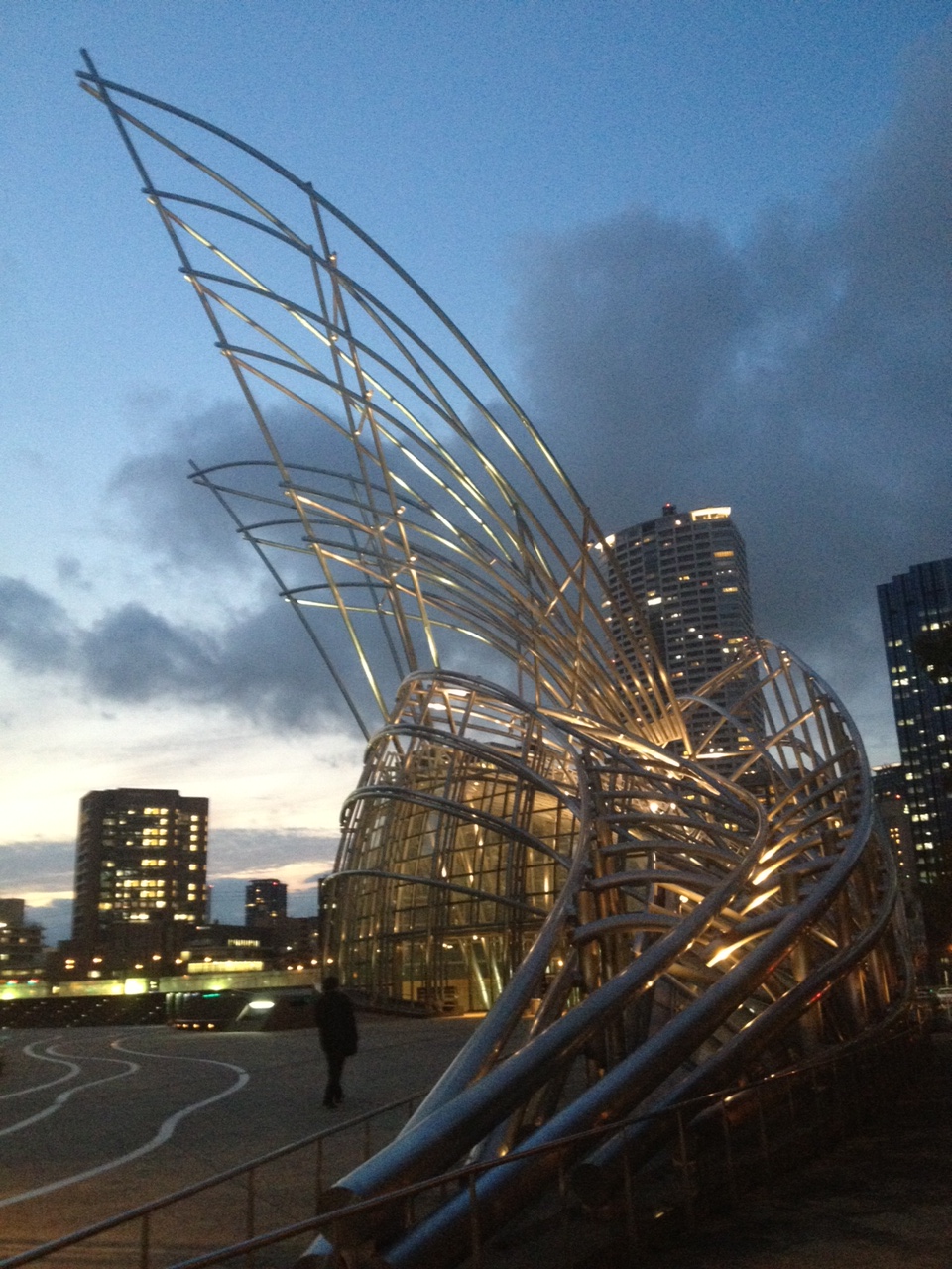 We began the evening at Osaka’s National Museum of Art. On Fridays the museum keeps its doors open till 7pm and, once you’ve admired the impressive structure hiding the entrance way, you can descend into the galleries and while away the time until dinner. We perused the “What We See†exhibition (runs until 24th March, 850yen), a collection of ten video installations by international artists, including two from Japan. This special exhibition uses the moving image to explore the boundaries between fiction and reality in an increasingly globalised and image focused society. I don’t claim to know anything about art, but it was an interesting experience, my personal highlight being Finnish video artist Eija-Liisa Ahtila’s “The Annunciationâ€.