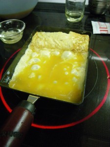 - Add a little more egg mixture and once that’s almost cooked, roll the previously cooked egg back over it before moving the now combined roll back to the end of the pan.