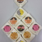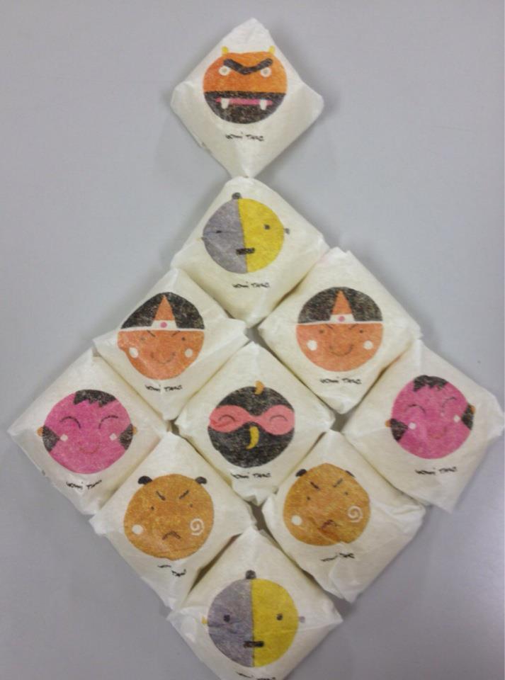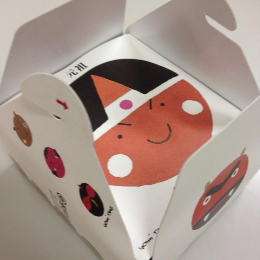 Upon opening the box there was a little card with similar artwork to the exterior upon which was written the Momotaro story. The kibidango themselves were each individually wrapped in little wax paper balls with one character from the fable printed on each.