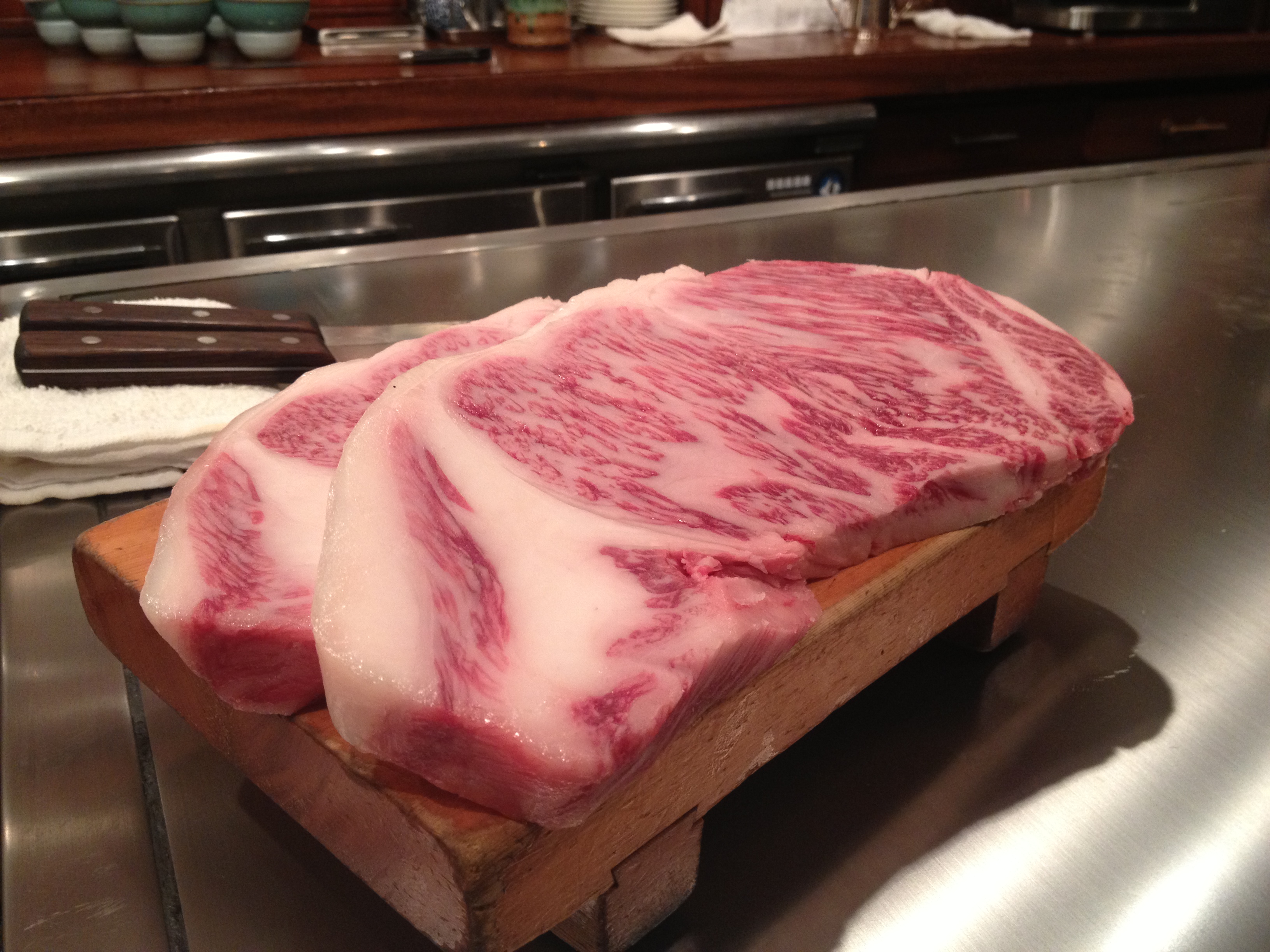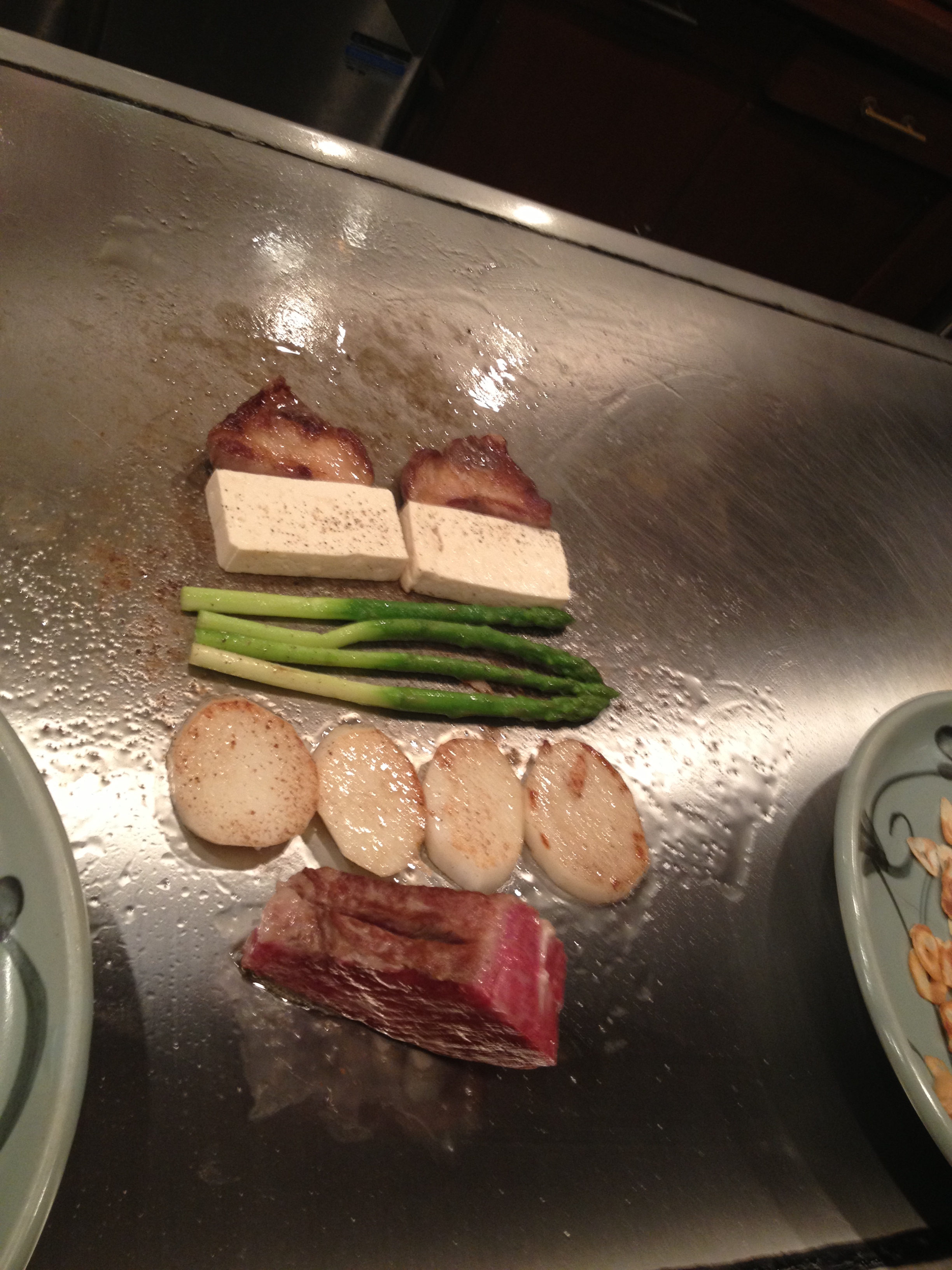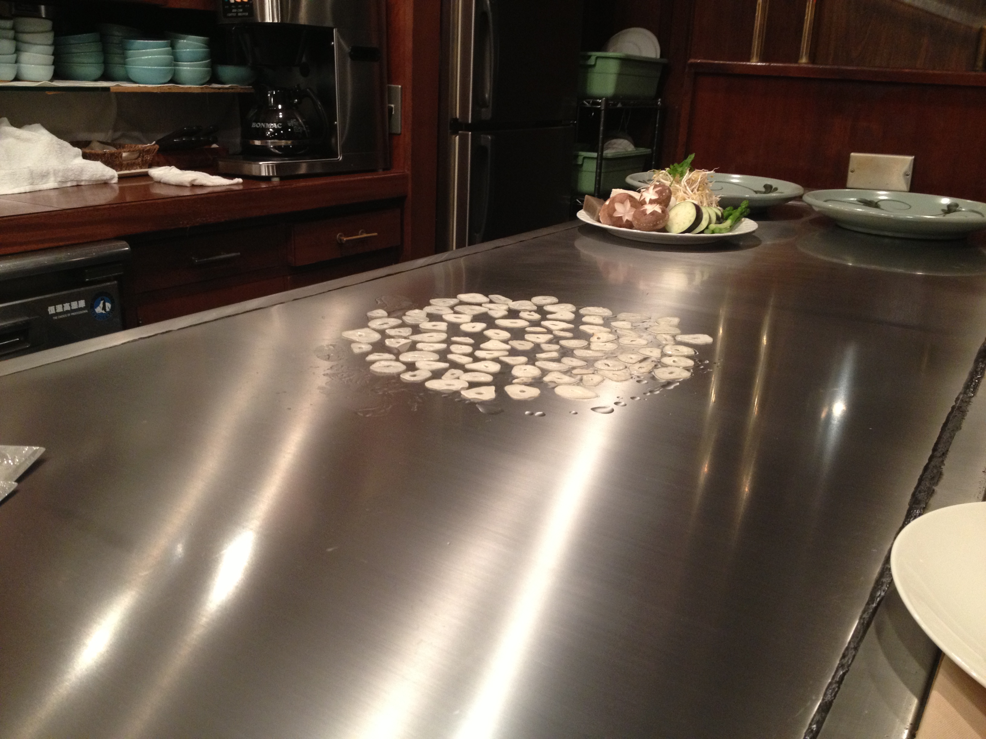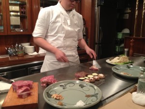 The Kitano restaurant came recommended by a friend and the bible (Lonely Planet) and has become the highlight of my Japanese culinary journey thus far. The restaurant itself has a simple charm; wood panelling and mood lighting create a relaxed but decadent atmosphere. Instead of a traditional table set up you are seated at a bar, whose surface is pristine steel, the stage for the night’s performance. And what a performance it is. Once you have chosen which cut of beef to devour you can sit back, relax and enjoy the show.