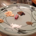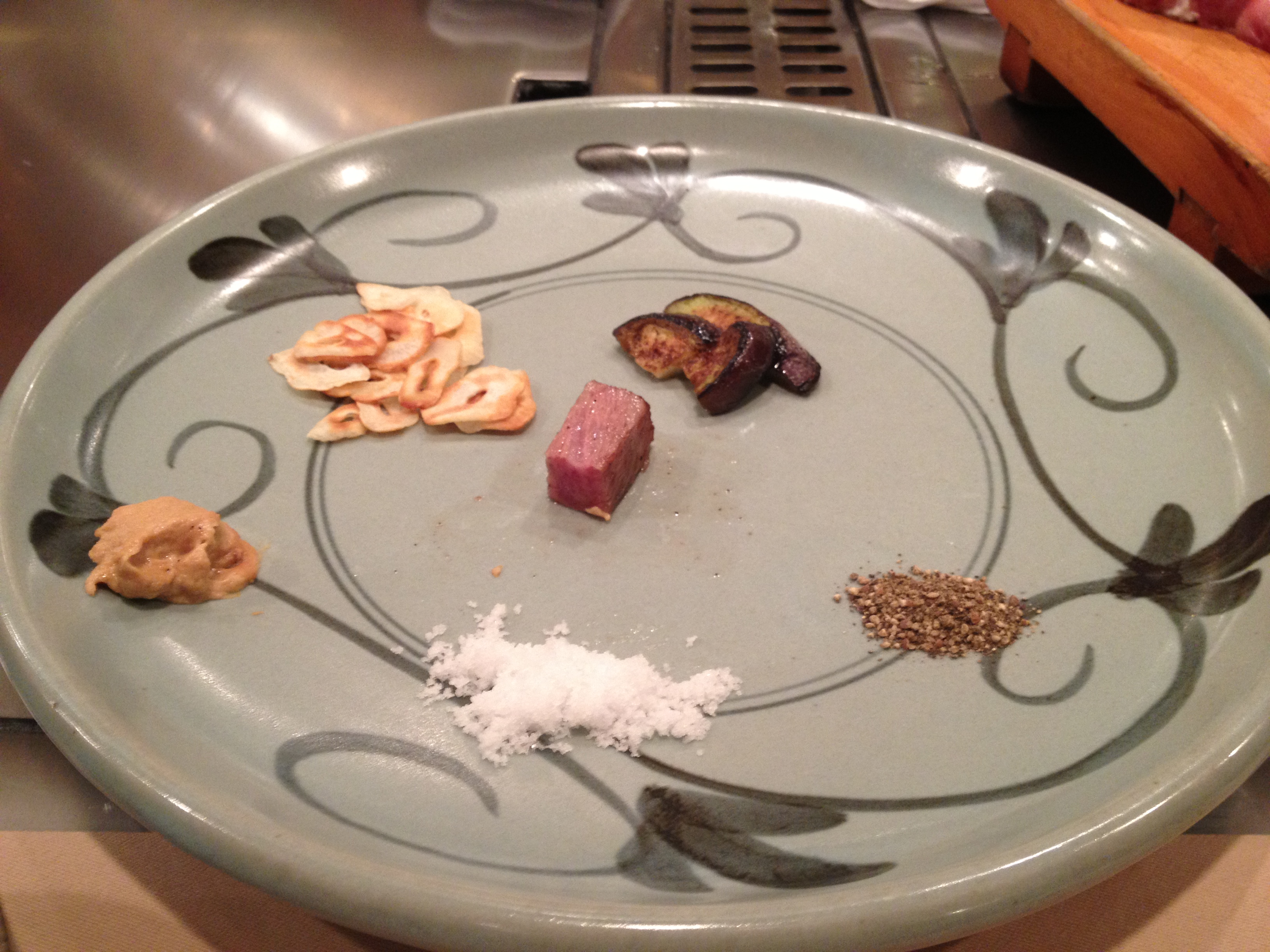 There is a selection of condiments to choose from: the crisped garlic from earlier, Japanese rock salt, black pepper, mustard, soy sauce and special vinegar. As each steaming mouthful is delivered to your plate your chef will recommend a condiment (or combination) to accompany it, according to the texture of that particular soupçon. My personal favourite was mixing salt and garlic, but mustard with soy was also a delicious new discovery. The Kobe steak experience is most definitely a far cry from the usual rushed Japanese dining.
