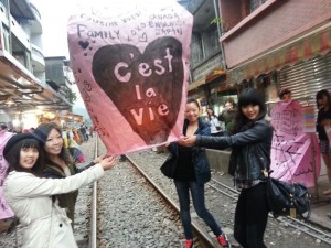 Shifen (are you getting confused yet?) is a quaint railway town famous for pretty much one thing – fire lanterns. You know those romantic paper lanterns that fly away into the sky. The latter half of the railway tracks were lined with fellow tourists releasing huge, colourful, personalized lanterns into the dimming sky. At NT$100 a pop we were straight in, paint brushes in hand. We spent an unreasonable amount of time decorating all four sides of the lantern with typical things like “Taipei 2013†but the idea was to write wishes and send them off to be granted. We posed for an unfathomable amount of photos from all angles before we handed our beloved lantern to the atmosphere.