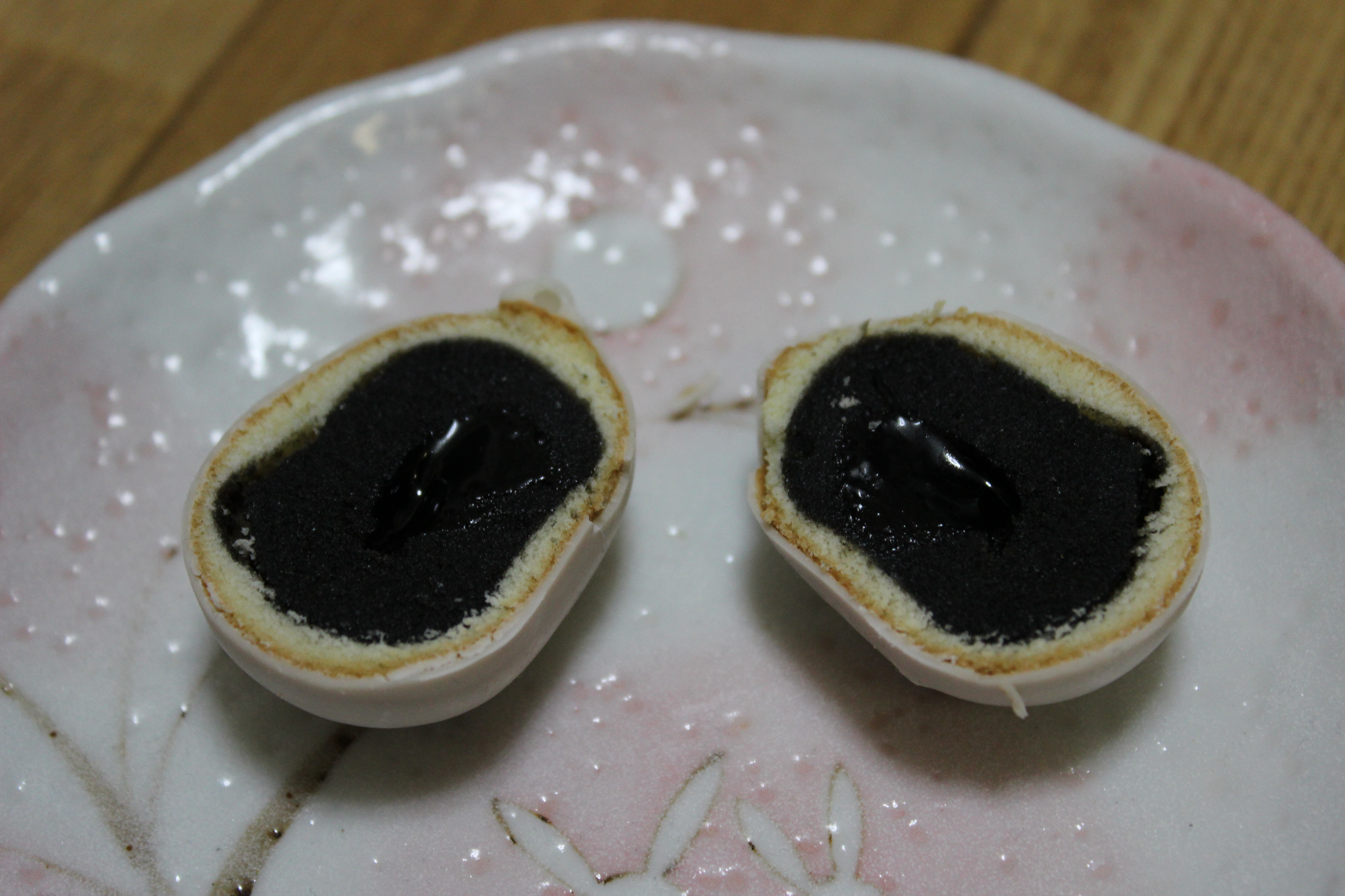 The centre is a sweet paste consisting of kurogoma 黒胡麻 (black sesame seeds) and anko 餡å (red bean paste) which is supposed to constitute the ‘yolk’ of the egg – perhaps they are meant to be piitan 皮蛋 (Chinese century eggs) ( ^ω^ ). This ‘yolk’ is then coated in a thin layer of kasutera カステラ (castella cake), a type of Japanese cake whose origins lie in 16th century Nagasaki and trade with Portugal. It is immensely popular these days. Finally the tamago is coated in a thin layer of white-chocolate to form a delicious crispy ‘shell’.