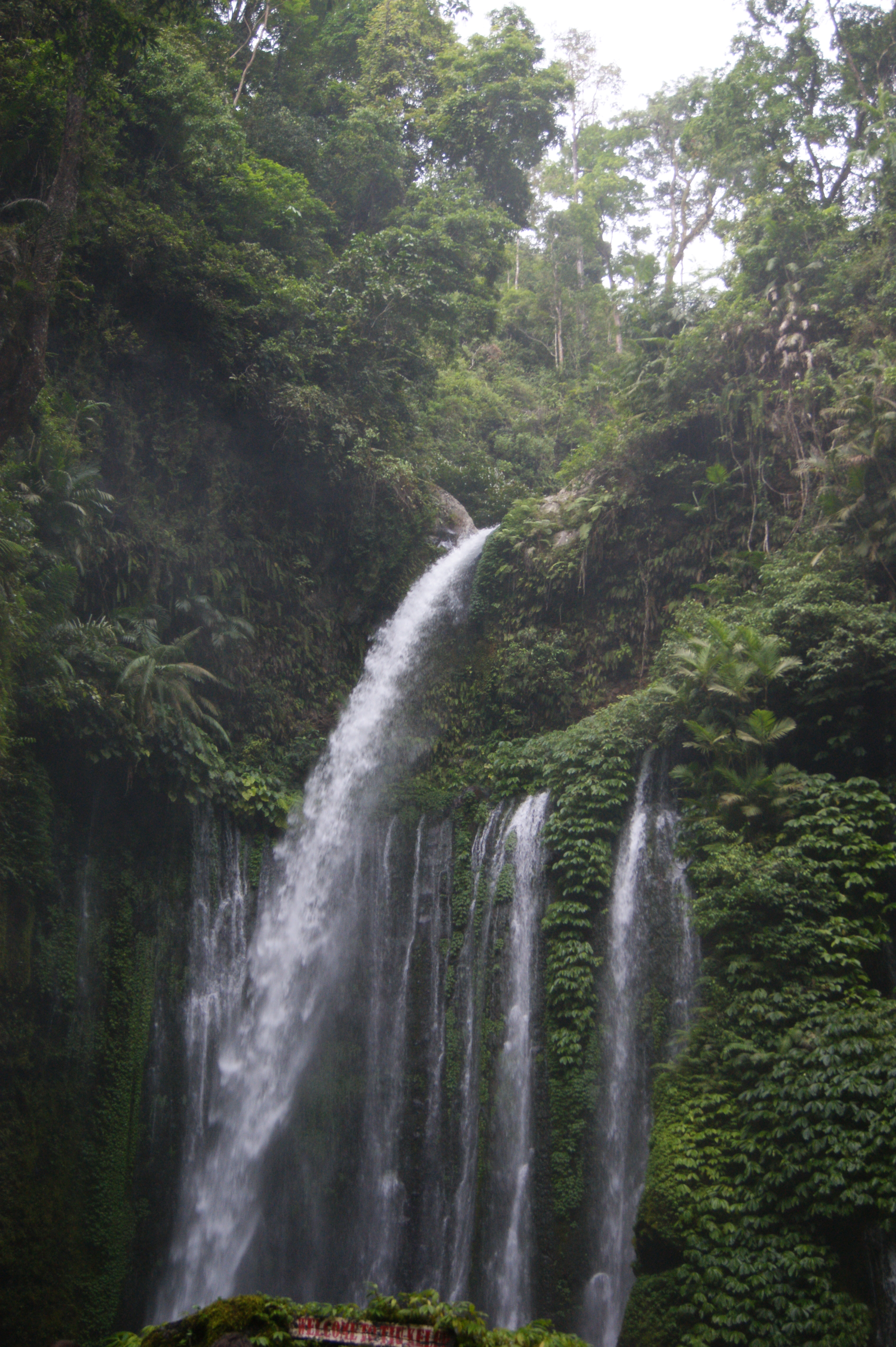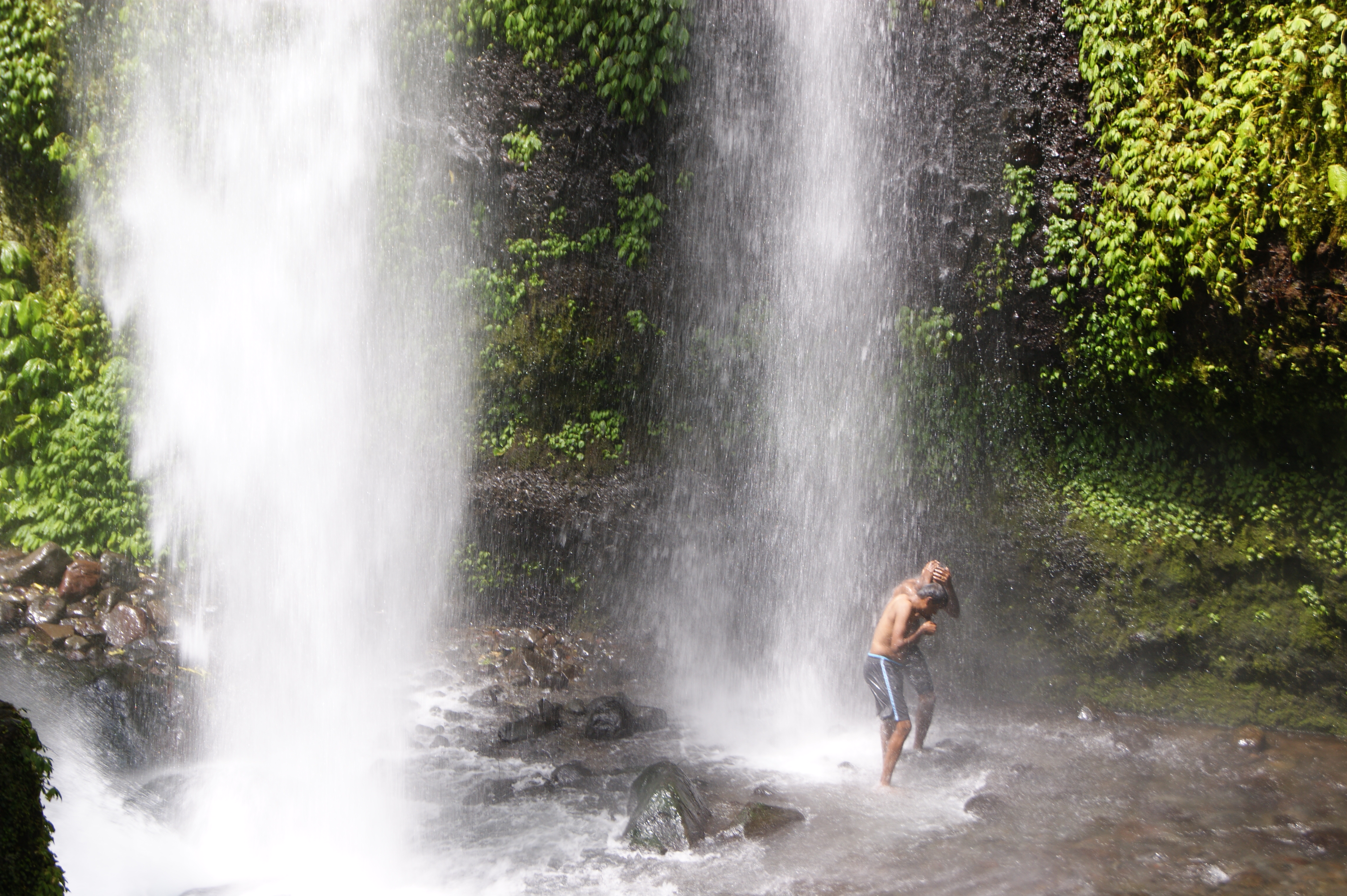 village, just inside the park. From here a stroll and a scramble will take you through majestic jungle, past (and potentially through the tunnel of) an aqueduct, to two beautiful waterfalls. The first waterfall, Sendang Gila, is just a 15 minute meander along man-made paths into the forest. Although a very picturesque waterfall, I really recommend the extra 40 minute trek through the jungle (and at times knee-deep in the river) to the second, Tiu Kelep, where you can strip off for a plunge. Tiu Kelep’s waters are renowned for their healing qualities, and for every time you swim behind the main waterfall you become a year younger. Be warned, however, that the force of the