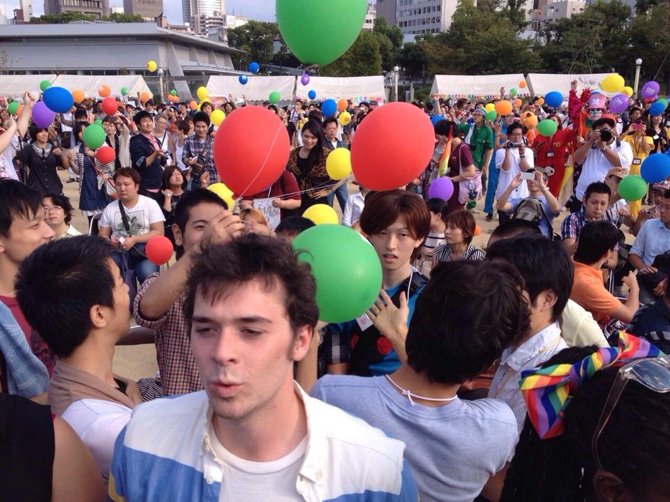 If the parades pervasive air of effusive kawaii-ness displaced the more serious political undertones of most LGBT events, it nevertheless underlined how unusual such extravagant displays of identity are in Japan. At the end of the day, the MC invited the crowd to simultaneously release all the balloons which had been distributed throughout the crowd during the parade at once. ‘Change’, he proclaimed, as a friend translated for me, ‘can only come when we stand together’. Such a clichéd sound bite gained a new resonance in a community so often invisible in mainstream Japan. As a kaleidoscopic mass of balloons rose into the dusk, it seemed an appropriate metaphor; a small but defiant splash of colour against the grey Osaka skyline.