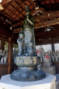 The Honzon’s depiction of Kannon riding on the back of a turtle has to do with the founding legend of the temple. Founder Chunagon Yamakage Fujiwara (also known as Masatomo Fujiwara) is considered the originator of Japanese cooking and is the patron deity of chefs. About a thousand years ago, when his father Takafusa was getting ready to board a ship on the Yodogawa he saw some fishermen had caught a large turtle which was probably going to be killed. Dedicated to Kannon and compassion, he purchased the turtle and set it free in the river. The next day as he boarded the ship, he was told his young son had fallen overboard (actually he was thrown by his wicked stepmother, but that’s neither here nor there). Takafusa prayed to Kannon that he would build a temple to share Kannon’s compassionate nature with others if she would be able to save his son now. And who should appear just then but the little boy, borne up through the water by the very turtle Takafusa had just saved!