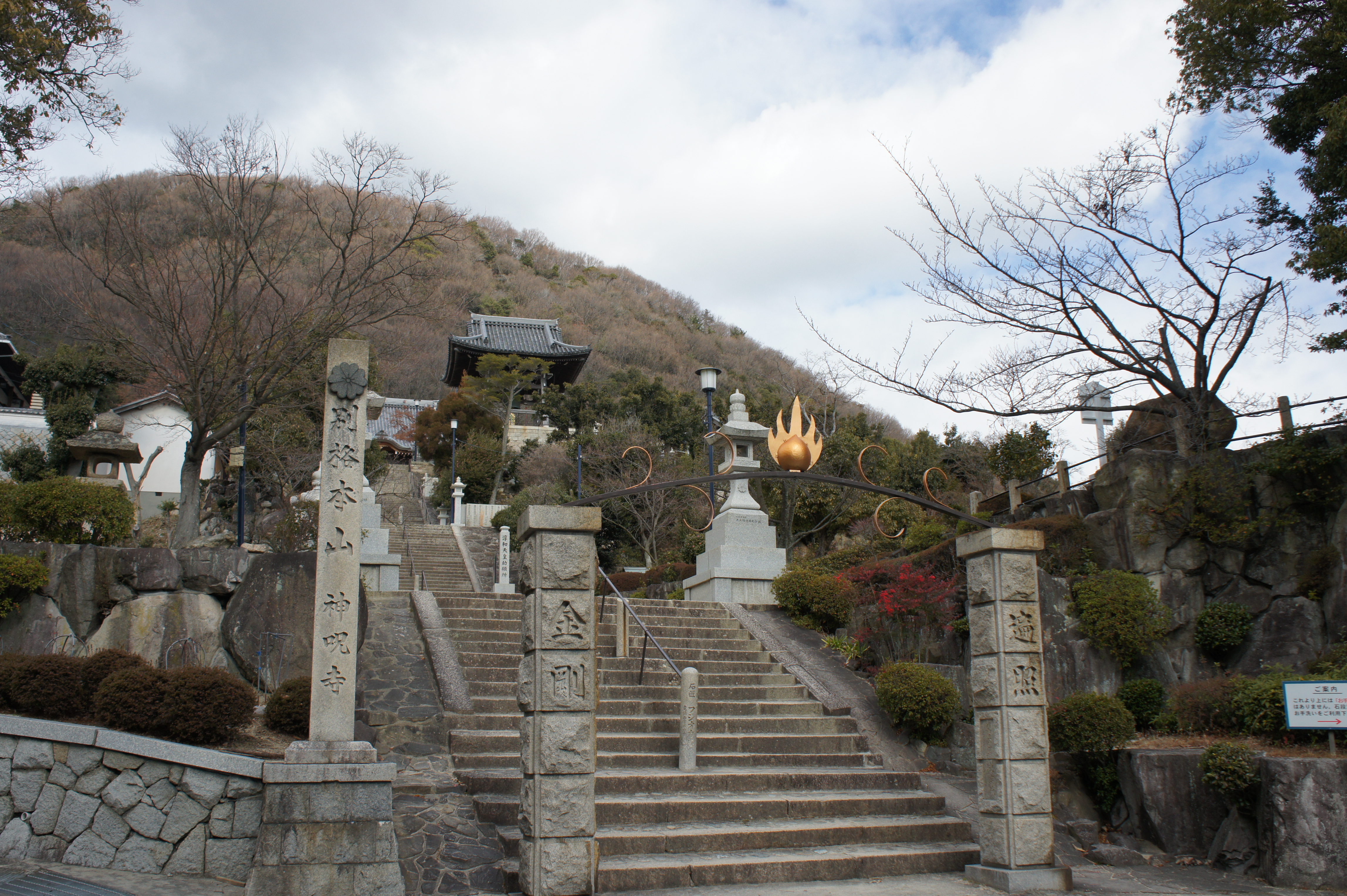 Getting off at Koyoen Station, I walked north up the hills through winding neighborhood streets for about two kilometers. After passing through the center of the residential district, there is an abundance of Japanese signs reading “神呪寺â€: Kannoji Temple. Also, being Japan, there is a profusion of vending machines selling hot and cold drinks and, just in case you forgot, energy bars for intrepid hikers. Life. Saver.