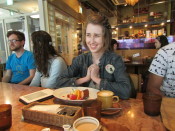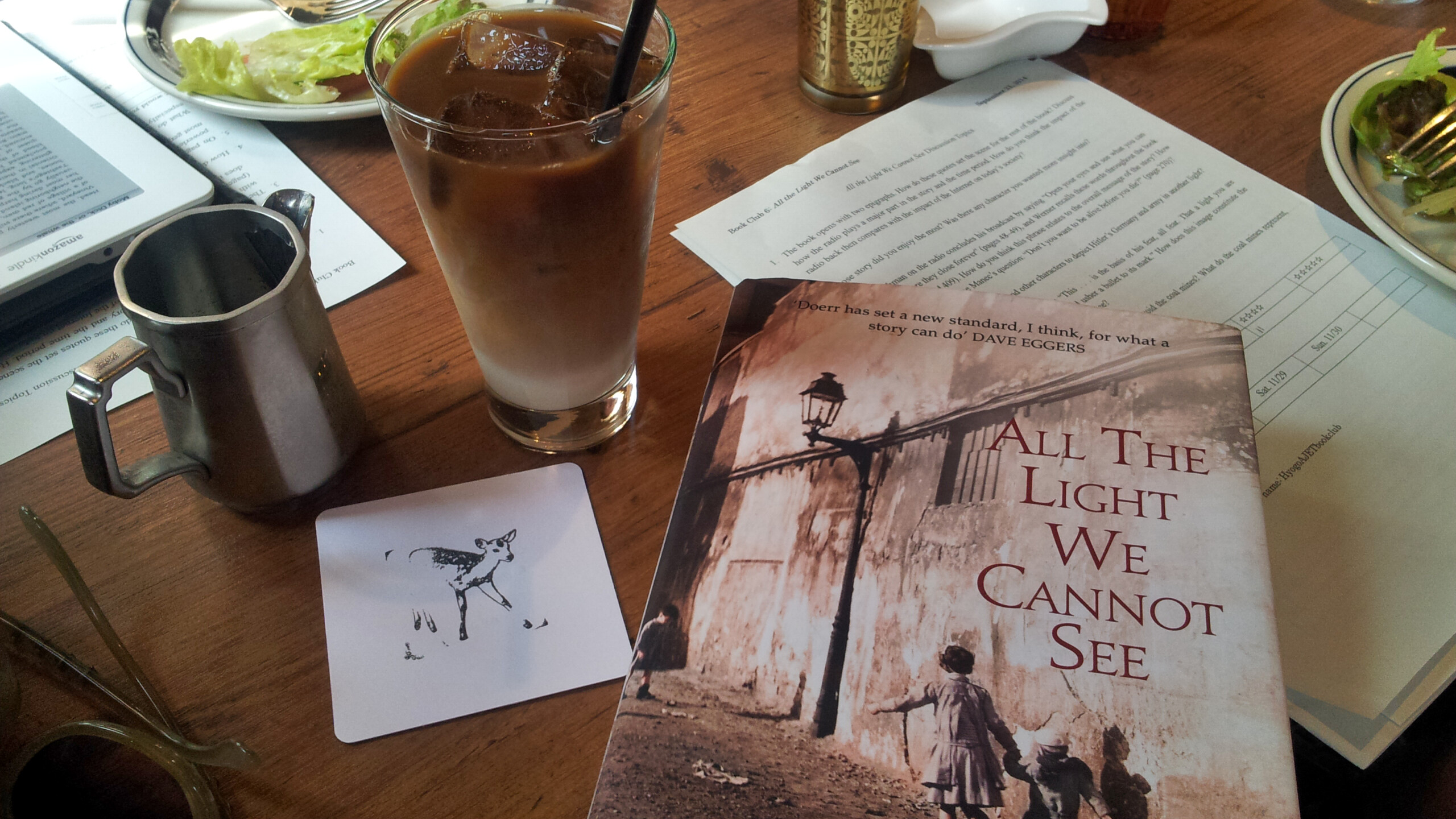 Between bites of cake, salad, and hamburger steak (yes, I got the hamburger lunch set) came book suggestions, thoughts on Ender’s Game, and a consensus that it was overall a good read. Everyone differed on whether or not they’d want to read the series and there was some debate about the ending, but the book received a 3-4 star rating from this round of book club attendees. Post discussion, a game of smart phone charades broke out to the amusement of the café  guests surrounding us, but thankfully the café’s atmosphere lent itself well to the shenanigans and made for a nice conclusion to the insightful discussions and tasty food and drink with smiles and laughter.