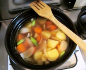 3. Pour in dashi stock, carrots and potatoes and simmer for 5 minutes.
