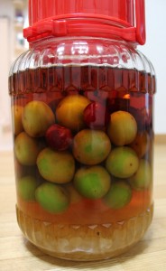 6. Seal up your jar, put it in a cool dark place (think basement) and forget about it for the next 6-12 months. OK well this isn’t entirely true, as for the first couple weeks you’re going to want to check up on it every day or two and give it a shake to make sure all the sugar dissolves and none of the ume are going mouldy. Honestly so far I haven’t had any issues with the ume but about half my cherries have started to shrivel and die so I have been removing them from the batch as this occurs.
