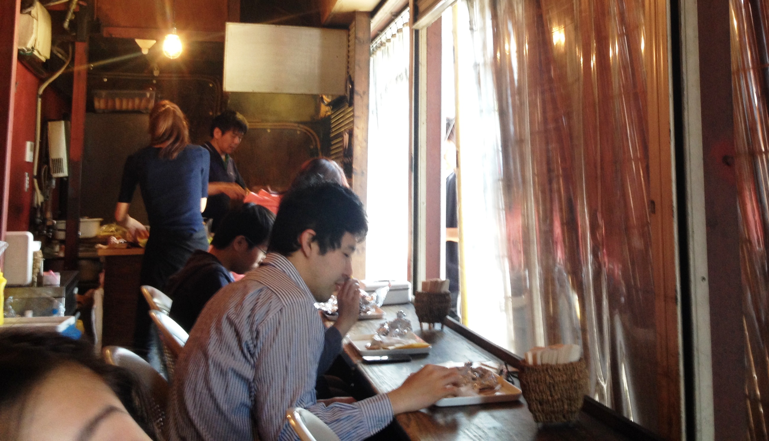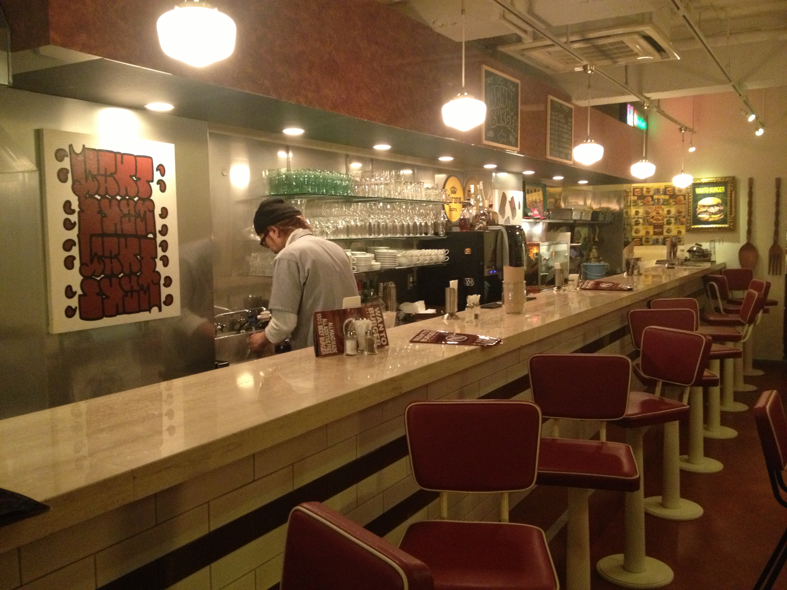 Wanto Burger, Sannomiya [Charlotte ate the house special, the Wanto, Cherie a cheeseburger]  Charlotte says:I had to opt for the house speciality, the Wanto, mainly for its description as being a “super special powerful rich burgerâ€. It didn’t disappoint, but then with a Kobe-beef patty, Wagyu steak slices on top, home cured bacon and spiced egg how could it? Not something I could eat (or afford) regularly, a Wanto burger is definitely a special treat. I liked the American style diner vibe too and the waiters are a good laugh. Â