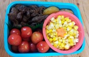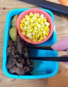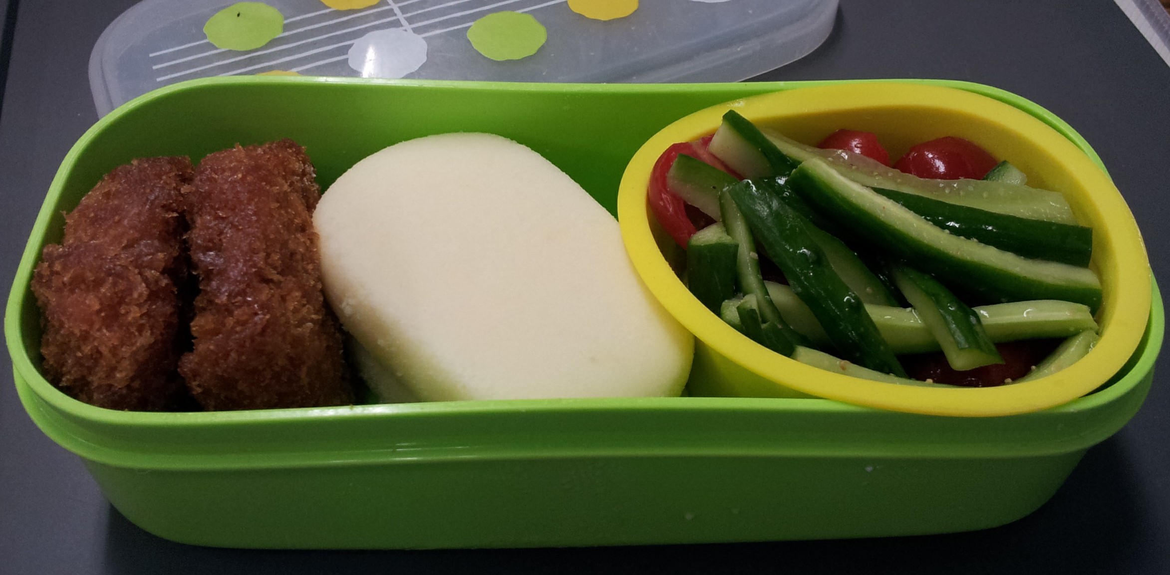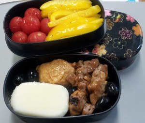 While I have been known to dump my lunch in the box with spoons and fingers, placing each piece for optimal artistry and hygiene requires the precision of chopsticks. When planning the meal use colorful foods, then, arrange the box to set off the colors. For example, the cherry tomatoes and yellow bell peppers in this bento make bright blocks of color, and the black olives contrast nicely with the white potato cakes. I needed the chopsticks to keep those peppers straight and to place the chicken sideways. It may seem simple, but taking the time to place the food carefully makes all the difference to an attractive bento.