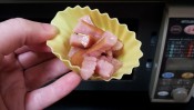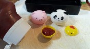 Silicone cups work well to keep wet or small foods from the rest of the bento. For example, in this plain bento of potato cakes, fish croquet, and salad, I used a yellow silicone cup to keep the salad dressing from making the rest soggy. Dividers are also versatile separation tools. Many bento boxes include hard plastic types that match the box’s design, but there are many cute disposable kinds available as well. When packing the bento work from one end to the other, placing the dividers as you progress. Tiny bottles and containers are perfect for sauces and condiments that might make a food mushy or ugly. Using one or more separation tool is an easy way to make a beautiful bento.
