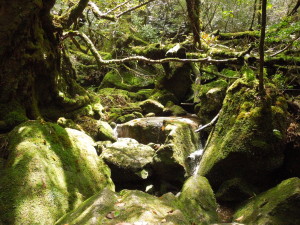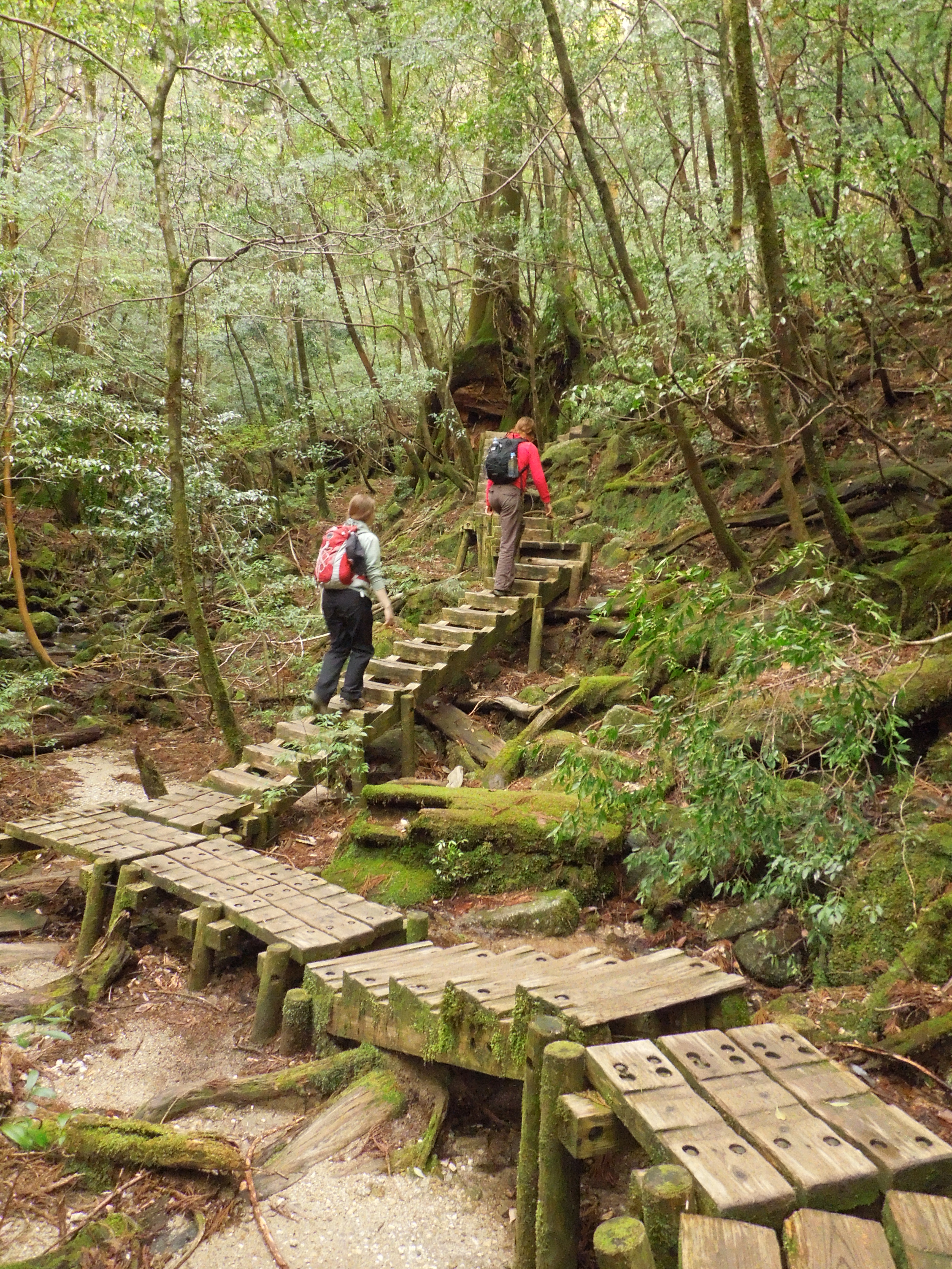 Less than two hours before the trail’s end, you’ll come across Wilson’s Stump.  Circa 1912, English botanist Ernest Henry Wilson explored Yakushima and “discovered†a giant cedar tree stump. He estimated that when the tree was cut down, sometime in the 1500s, it was over 3,000 years old. The stump has a diameter of 4.3 meters (14 feet). At least twenty visitors can enter through an arch in the wooden walls at the same time.