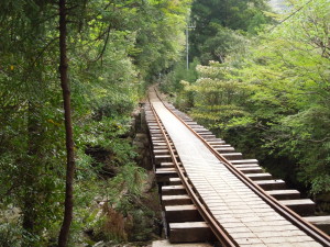 The first two and a half hours of the hike follow the tracks of the old railroad. In the early 1900s when the forest was heavily harvested, the railways were used to transport giant cedar trunks. This part of the trail is a mixture of eerie and boring. The tracks curve around the sides of the mountain, crossing powerful rivers and gorges. Like most nature hikes in Japan, there are no barriers, no railings, nothing to stop you from falling off the countless bridges and suspended tracks. Every so often you’ll see scraps of metal ripped up from the old rails or forgotten pieces of new tracks never built, hidden among the foundations of abandoned towns.