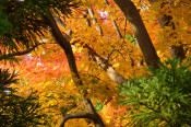 Located in the northern part of the city and surrounded by rolling hills, Koetsu-ji offers visitors scenic views of Kyoto. The temple was named for Koetsu Hon-Ami, a calligrapher, ceramic artist, and master of tea ceremony in the early Edo period. Koetsu studied with masters of several different schools ofèŒ¶é“ (sadÅ), or tea ceremony, including Furuta Oribe, Oda Urakusai, and Sen SÅtan. Because of this, the temple grounds contain seven different teahouses. The teahouses are often closed to the public, but the garden they are in is beautiful in its own right. The paths wander amongst the teahouses, and the various benches and gazebos make great spots to stop and admire the fall foliage. Since the grounds are fairly extensive, it is easy to lose sight of other visitors and feel as if you are alone in an autumn wonderland.