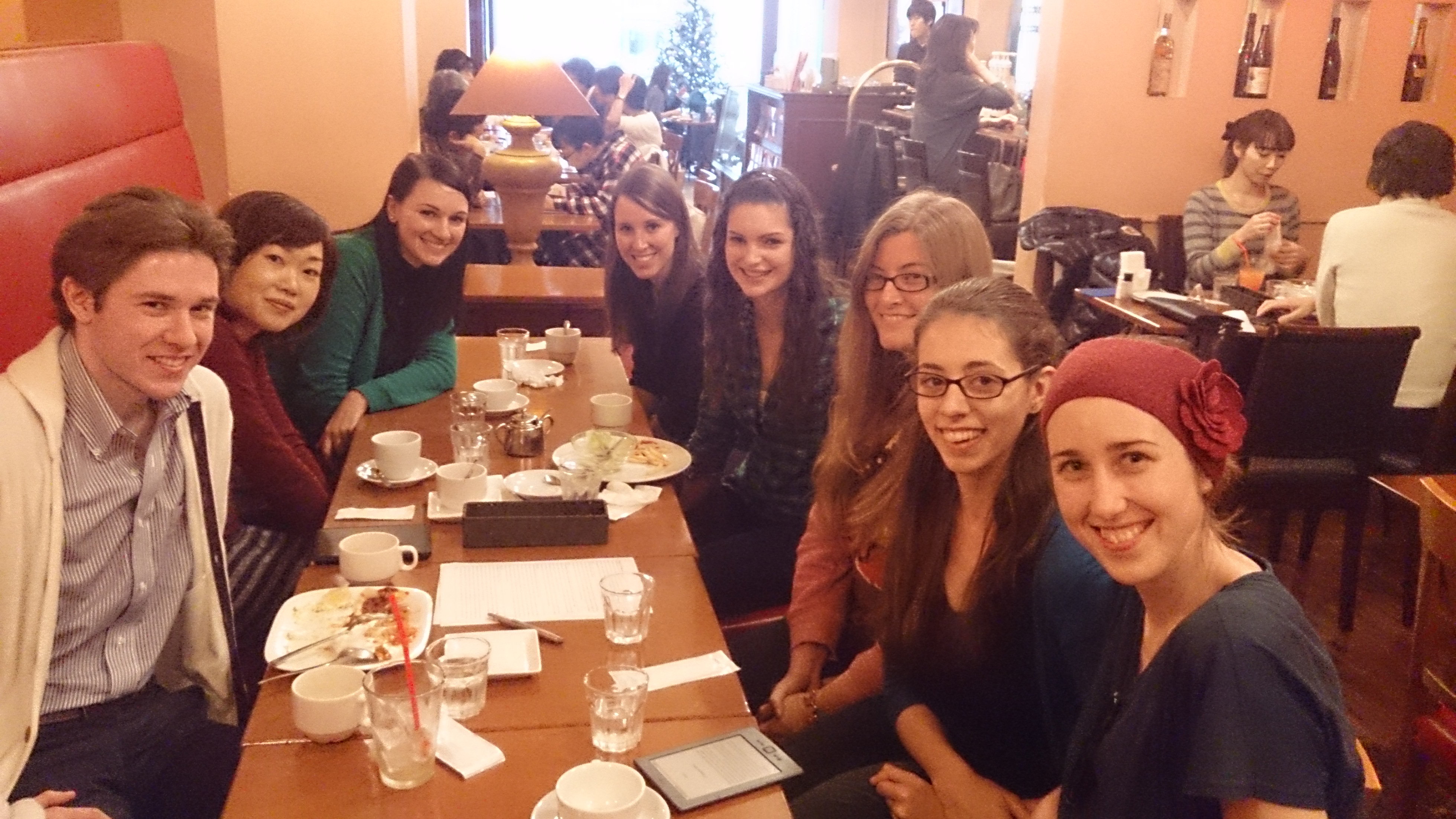 Starting their day by wrapping themselves in scarves and wearing Uniqlo Heat Tech for what they believed would be a typical Japanese winter afternoon, HAJET Book Club members soon found themselves removing articles of clothing (some might think inappropriately) while expressing their surprise at the unexpected heat with comments like, “It’s so hot†and “This winter is a lot warmer than last year.†Little did we know that the communal reaction toward the weather would inevitable result in a timely jinx and the following week would in fact be the official start of winter weather for Kobe. After meeting at the East Exit of Motomachi JR Station, eight JETs and one Japanese translator made their way up Tor Road to Ripples Café and Restaurant.