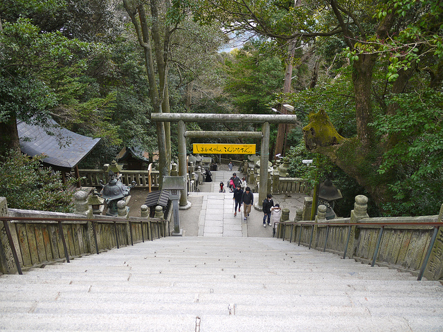 I have so many good memories, but I will only tell you about the first time I attended the festival at Kotohira-gu (also known as Konpira-san), famous for its 1368 stone steps. Once a year in October, the goddess of the sea is carried down the mountain in her ornate mikoshi. My fellow JET and I, and our respective Japanese moms went to the town for the festival. We climbed up hundreds of stone steps past closed shops and dark stone lanterns to the highest point on the mountain where non-members of the procession were allowed to stand. It was almost completely dark with only a few small lights here and there. Most of the illumination came from torch-bearers in white costumes who were closely followed by water-bearers who quickly extinguished any stray embers. We chatted with fellow loiterers and waited for what seemed like a long time. Slowly we became aware of a strange sound. It seemed to flow down the mountain like a breath of wind in the dark. The single beat of a drum somewhere above signaled the start of the festival.